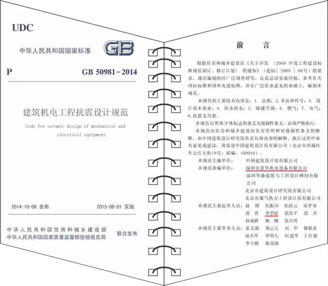 2008年汶川地震后,置华发起并唯一参编了国家标准《建筑机电抗震设计规范》(GB50981-2014)。规范的实施将逐渐造就一个千亿元规模的机电抗震行业。于此同时,置华还积极推动、参与了国家多份行业规范的编写工作,为建筑机电抗震事业的顺利实施贡献力量,置华是机电抗震行业当之无愧的缔造者和推动者。